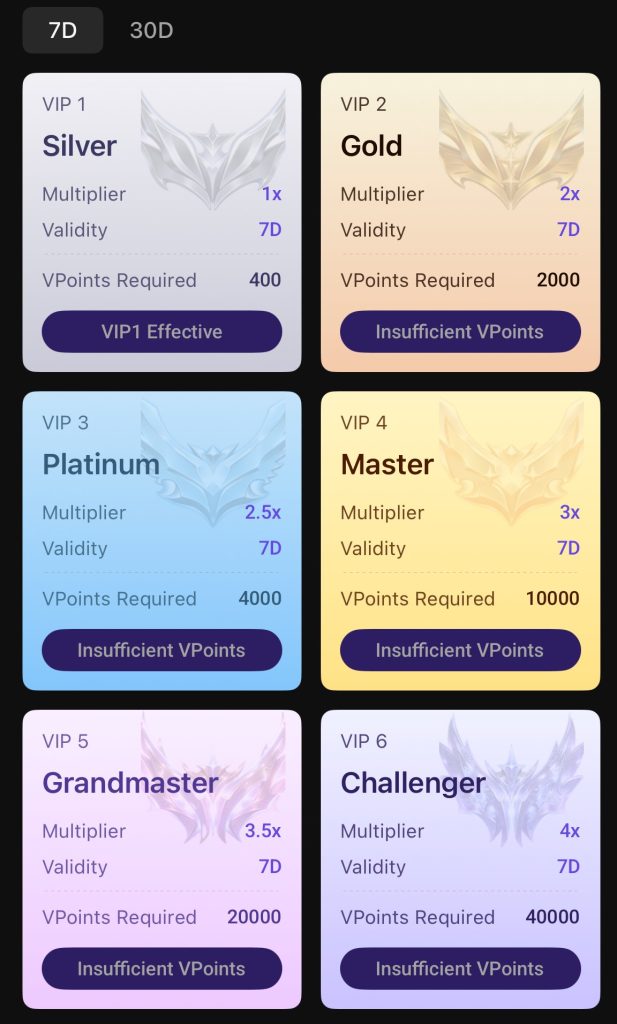 Wallet V has 6 VIP tiers. Each tier comes with a multiplier that boosts your chances of winning.