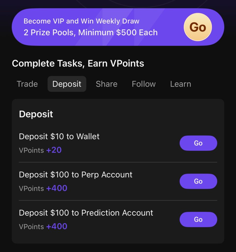 - Depositing $100 into your Perps account to receive 400 VPoints